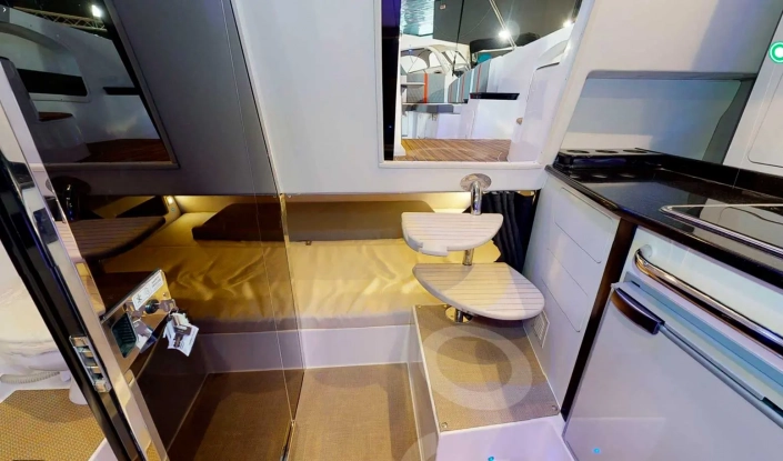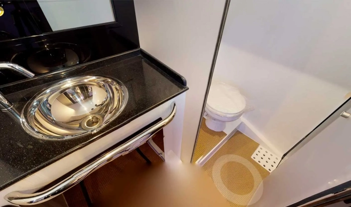 Un camarote en proa con cama doble con baño y ducha exclusiva.
