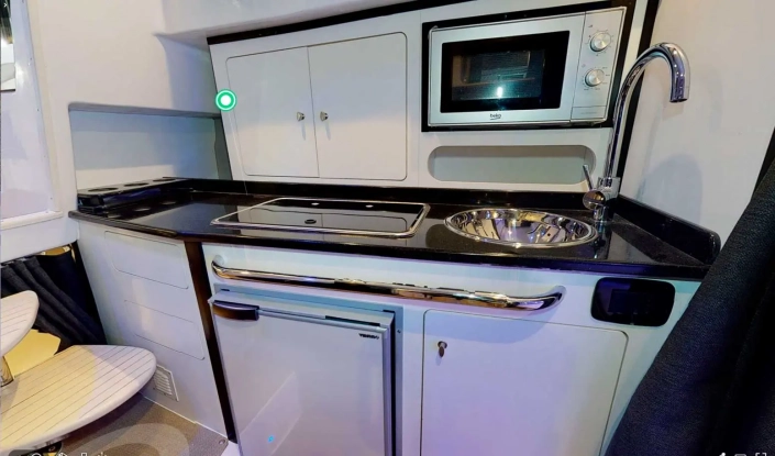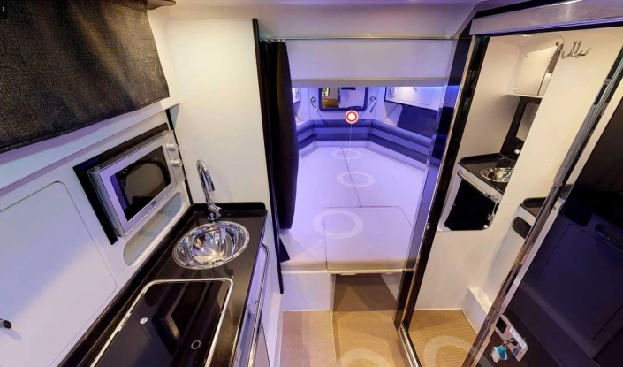 Su interior es amplio, cálido y confortable. Dos camarotes dobles en popa con baño y ducha compartida.
